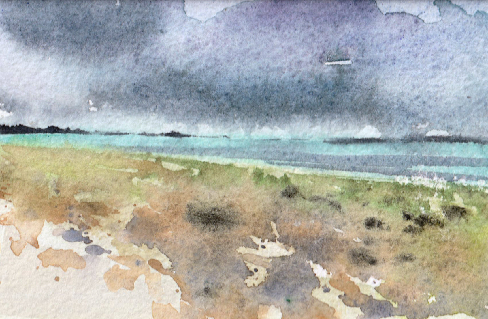 Whilst staying on St Martins we experienced storms and heavy rainfall. This painting is a view looking twaords Tresco from the beach close to our hotel. The tide was out and the shallow water was a light turquoise colour which was in stark contrast to the Indigo blue and violet sky. The green on the beach is the abundance of seaweed that is every present. The apinting measure 15cm x 10cm and is created on smooth watercolour paper. The painting is presented in an acid free mount and protected in cellophane. The painting is titled, signed an dated on reverse.